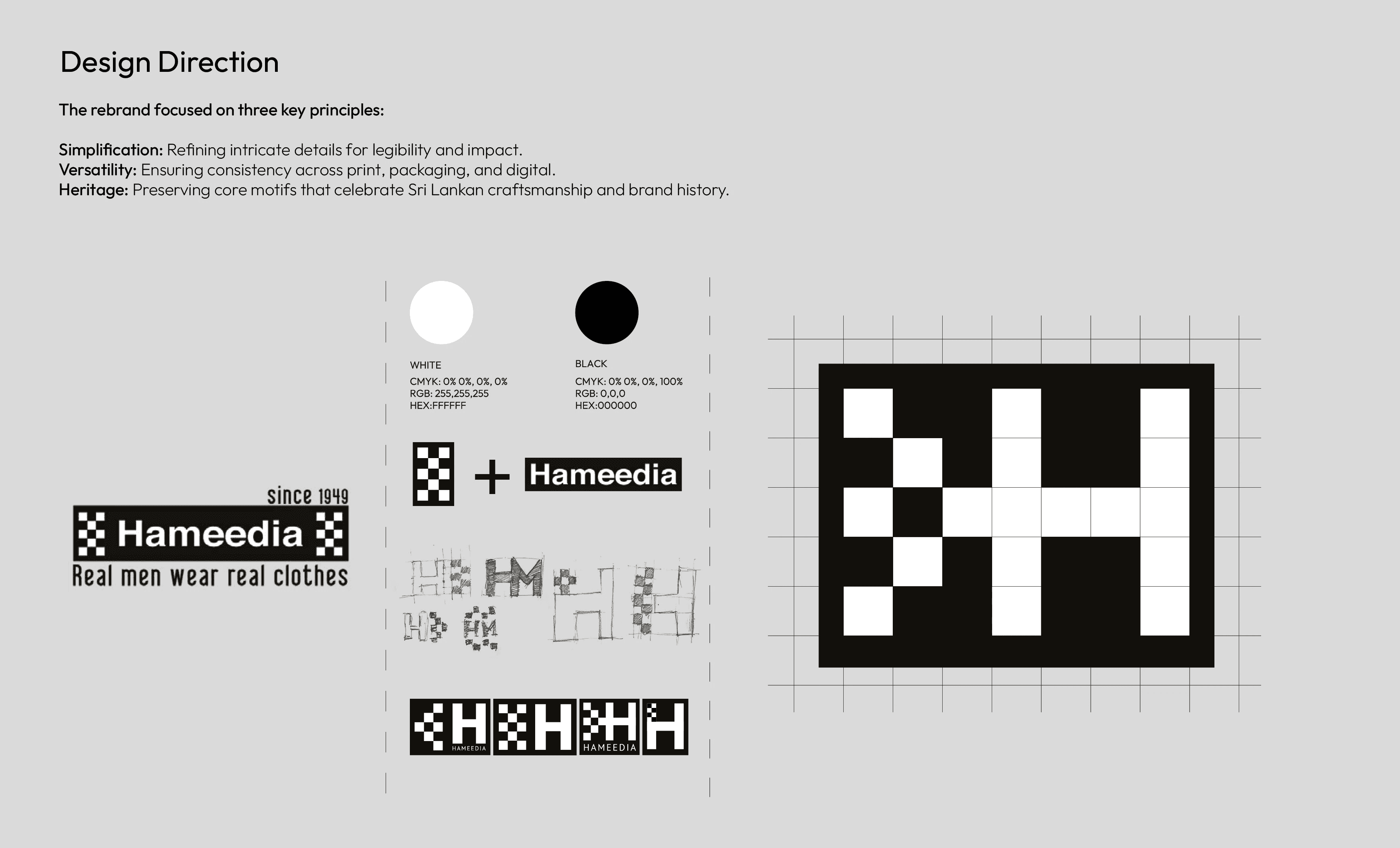 The Hameedia Rebrand is a strategic identity refresh for Sri Lanka’s leading menswear brand. With over 70 years of heritage, the goal was to modernise the brand while preserving its classic essence and instant recognisability. The new identity simplifies the original logo, retaining the iconic black-and-white checkerboard pattern and brand name — elements that have become synonymous with quality and craftsmanship. This modernised design ensures clarity, adaptability, and global relevance across digital and print platforms, strengthening Hameedia’s position as a trusted and timeless brand.