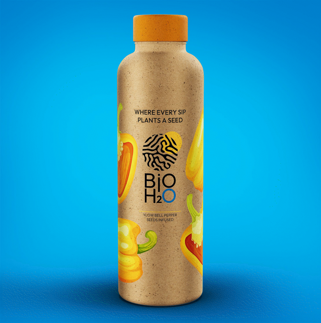 Bio H2O is a biodegradable water bottle designed to reduce plastic pollution and regenerate life. Made from banana fiber waste, each bottle is infused with seeds, allowing it to germinate into plants once discarded. The concept reimagines single-use packaging as a catalyst for growth — turning a sip of water into a step toward a healthier planet.