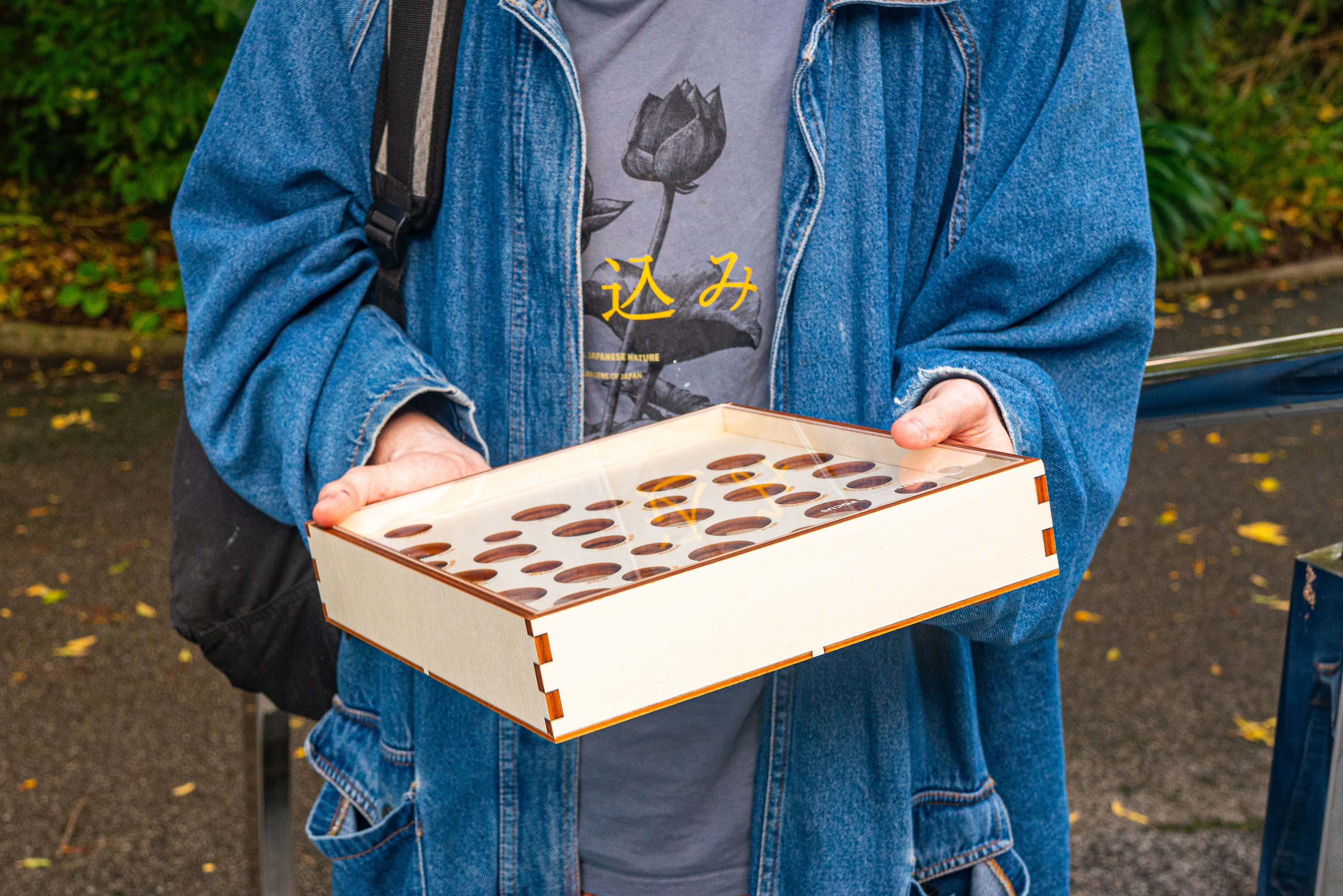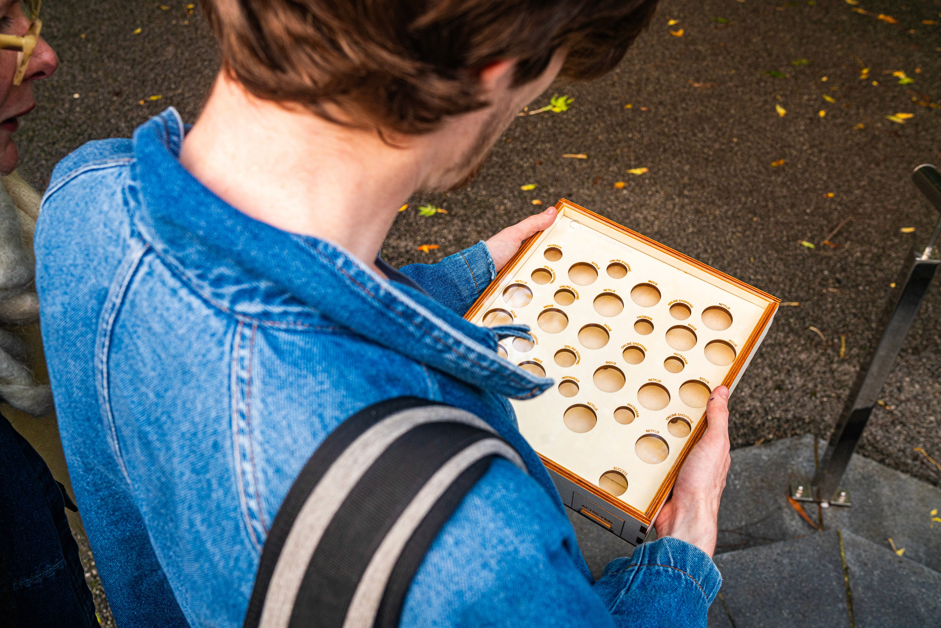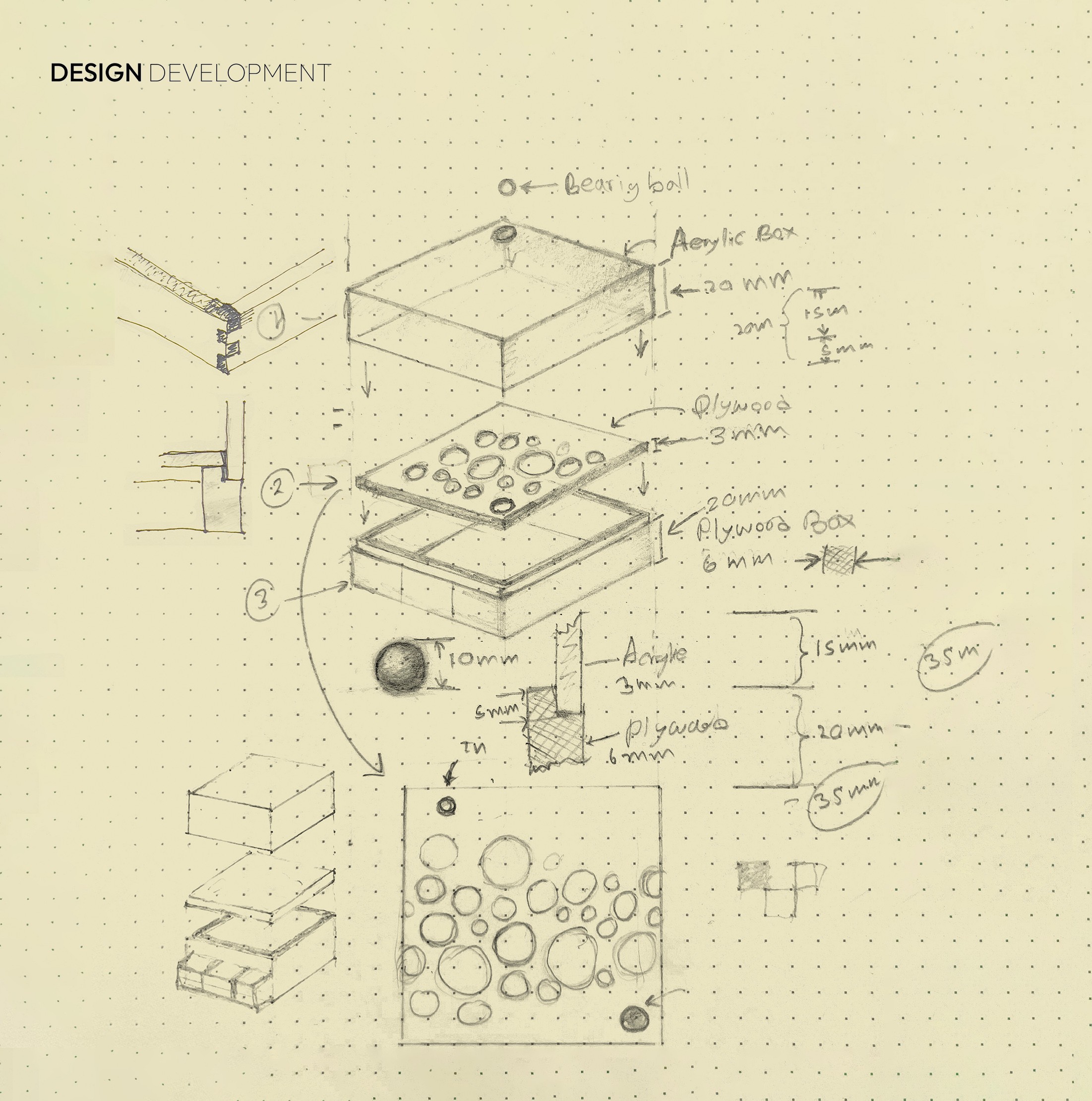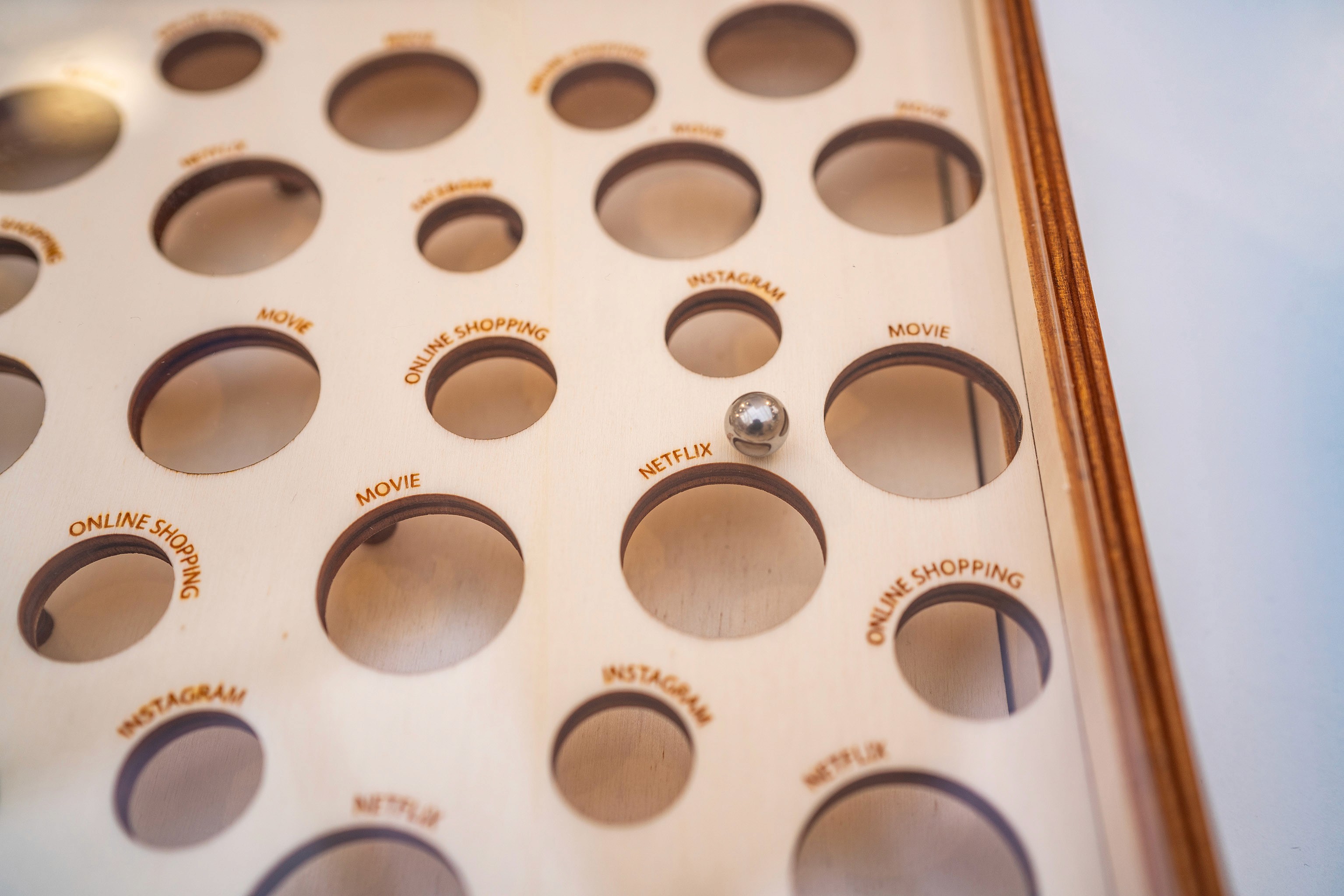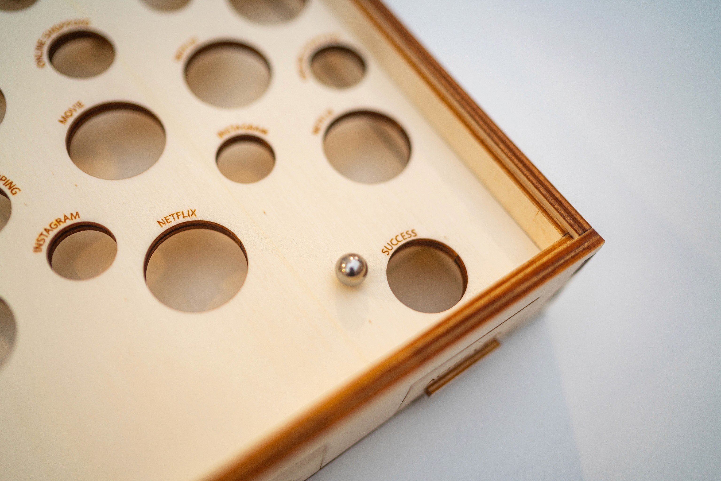 Pebble Game — a physical game where a metal ball represents ideas and creative energy. Players guide the ball through a maze of distractions (social media, movies, online shopping), aiming for the “Success” hole. The game visualises procrastination, turning focus versus distraction into a tangible, reflective experience.